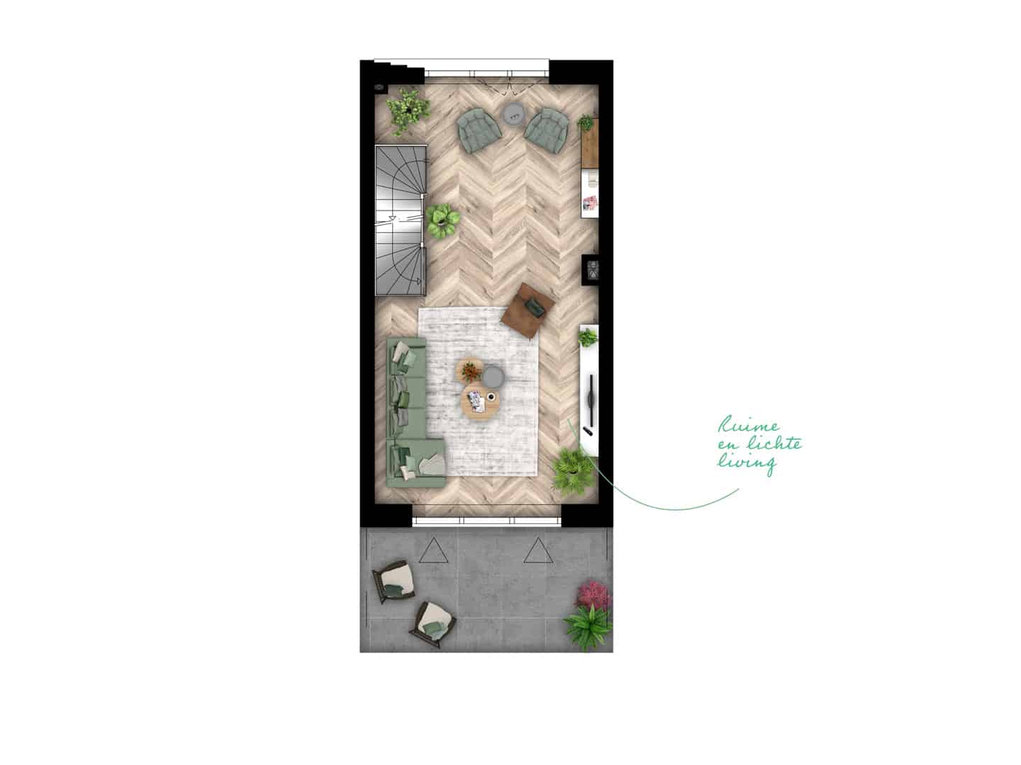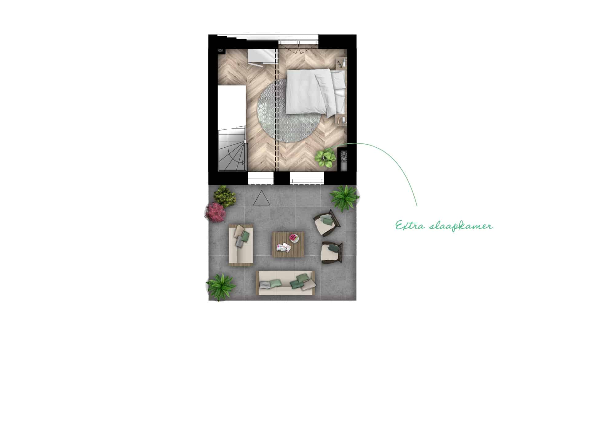 - Woonlaag met terras op 1e verdieping
