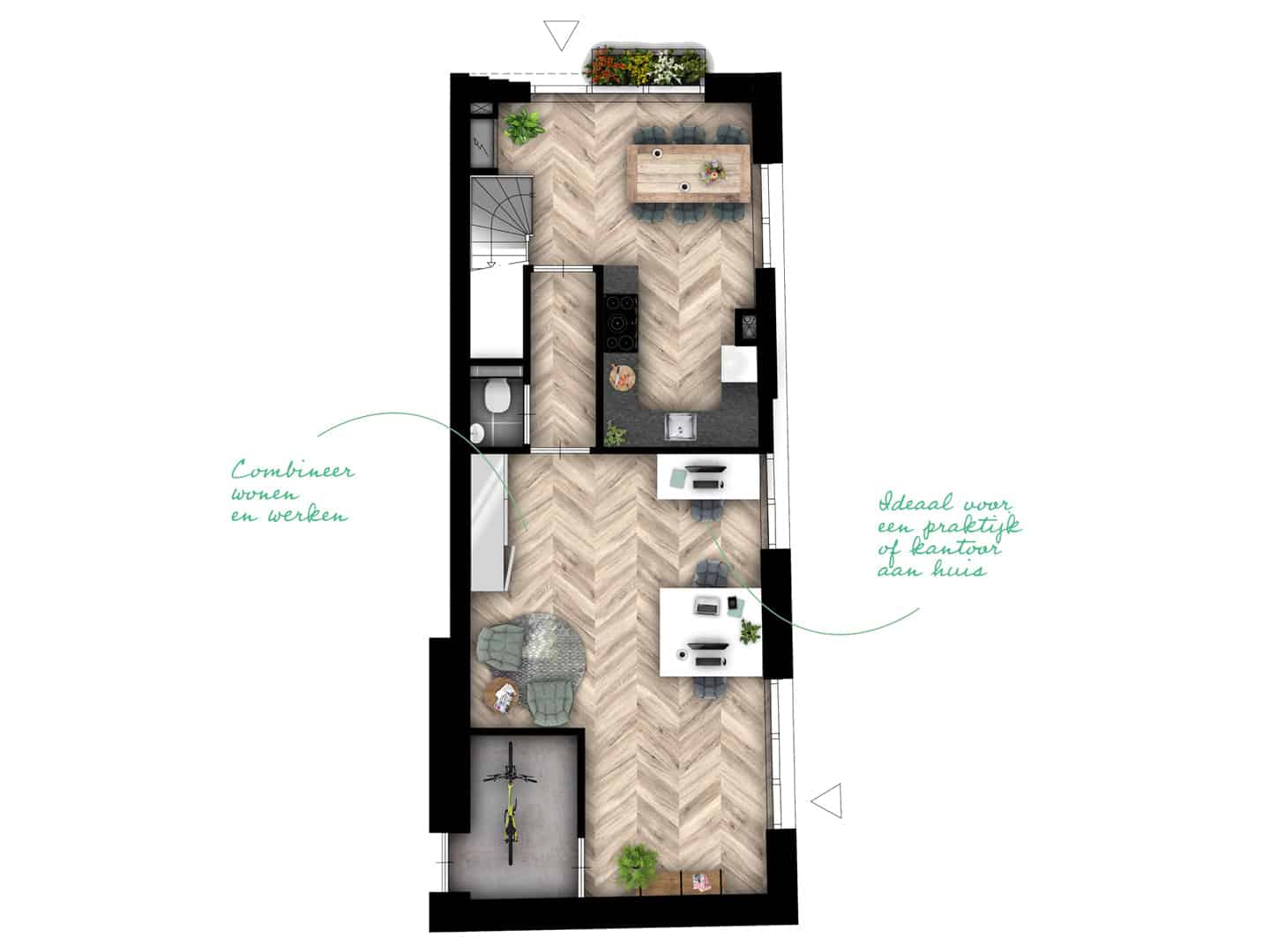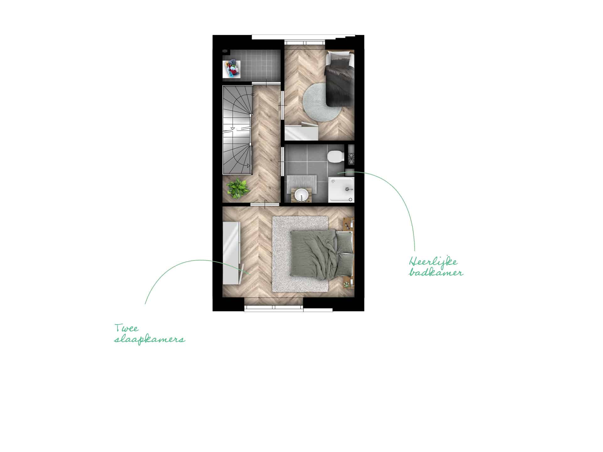 Op de tweede verdieping vind je twee slaapkamers en een heerlijk ruime badkamer. En wat doe je met de extra kamer op de derde verdieping? Wordt dat een speelkamer voor de kinderen? Of ga je voor een slaapkamer met uitzicht op het dakterras? Woon zoals je bent. Onafhankelijk. Sterk. STOER.